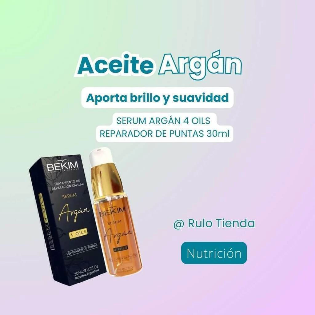 Aceite Argán BEKIM es tu nuevo mejor amigo en la batalla contra el cabello deshidratado. Este serum NUTRITIVO de 30ml está formulado con una mágica combinación de 4 aceites , siendo el aceite de argán el héroe principal. ¿Qué hace? Devuelve a tu cabello esa sedosidad, suavidad y brillo que pensabas que habías perdido para siempre. ¡Incluso incluye filtro solar!